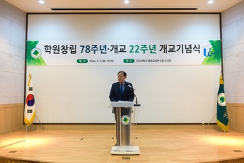 대구사이버대학교(총장 이근용)는 지난 2일 대구대학교 평생교육관 2층 소극장에서 개교 22주년 기념행사를 열었다.이날 행사에는 학교법인 영광학원 김동건 이사장과 이근용 총장, 김희숙 총학생회장 등 대학 구성원 80여 명이 참석한 가운데 ▲개회선언 및 국민의례 ▲내빈소개