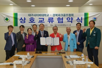 대구사이버대학교(총장 이근용)는 지난 1일, 학교 본교에서 경북파크골프협회(회장 이현준)와 파크골프 저변 확대와 전문인력 양성을 위한 상호 교류 및 협력을 위한 업무협약을 체결했다.이번 협약식에는 대구사이버대학교 이근용 총장을 비롯해 전종국 부총장, 김한양 기획입시처장