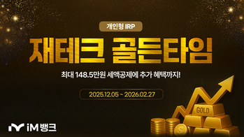 iM뱅크(아이엠뱅크, 은행장 황병우)는 연말정산 시즌을 맞아 세액공제 ‘개인형 IRP’ 상품 이벤트 ‘재테크 골든타임’을 실시한다.8일 iM뱅크에 따르면 개인형 IRP입금·펀드 매수 고객을 대상으로 상품을 추첨 증정하며, ‘개인형 IRP 재테크 골든타임’ 이벤트는 iM