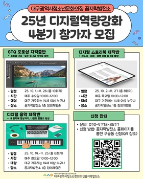 대구시행복진흥사회서비스원(이사장 배기철·이하 대구행복진흥원) 청소년문화의집 꼼지락발전소는 10월부터 청년·청소년과 지역주민을 대상으로 ‘디지털역량강화 4분기 프로그램’을 운영한다. 이번 프로그램은 급변하는 디지털 환경에서 수강생이 실질적으로 활용할 수 있는 기