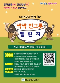 대구 달서구(구청장 이태훈)는 자원순환의 날(9월 6일)을 맞아 일회용품 사용을 줄이고 음식물쓰레기 감량 문화를 확산하기 위해 ‘용기내 챌린지’와 ‘싹싹 빈그릇 챌린지’ SNS 이벤트를 9월 1.~30일 진행한다.이번 이벤트는 달서구청 공식 블로그의 이벤트 게시글을 통