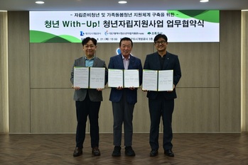 대구도시개발공사(사장 정명섭)는 지난 21일 대구광역시청소년자립지원관, 초록우산 어린이재단 대구지역본부와 함께 자립준비청년과 가족돌봄청년 지원체계 구축을 위한 ‘청년 With-Up!’ 청년자립지원사업 업무협약을 체결했다고 밝혔다.이번 협약은 복지 사각지대 청년들의 안정