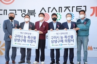 이재하 대구상공회의소 회장과 임성훈 대구은행장이 15일 구미농민대표에게 구미지역 농특산물의 적극적인 구매를 약속하는 상생구매의향서를 전달했다.대구상공회의소 회원사들은 구미 농산물로 이번 추석명절 선물을 준비하는 등 대구·구미 상생협력에 적극 참여하고 있다.14일과 15