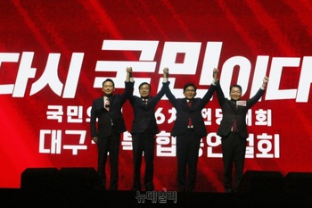 ‘다시 국민이다’ 국민의힘 제6차 전당대회 대구경북 합동연설회가 8일 오후 2시대구 엑스코에서 뜨거운 열기 속에 열린 가운데 김문수, 안철수, 장동혁, 조경태 후보가 대구경북 당원과 지지자들에게 손을 맞잡고 화답하고 있다.이날 행사장에는 당초 예상과는 달리 대구경북 당