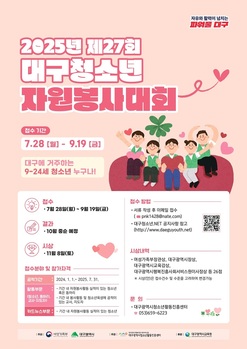 대구광역시행복진흥사회서비스원(이사장 배기철·이하 대구행복진흥원) 소속 청소년활동진흥센터는 ‘2025년 제27회 대구청소년자원봉사대회’를 개최하며 오는 9월 19일까지 신청 접수를 받는다.대구청소년자원봉사대회는 지역 청소년의 자발적인 봉사활동을 장려하고, 지역사회에 기여