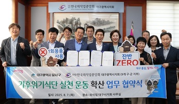대구 달서구(구청장 이태훈)는 지난 7일 (사)한국외식업중앙회 대구광역시지회 및 9개 구·군 지부와 ‘기후위기식단 실천운동’ 확산을 위한 업무협약을 체결했다. 이번 협약은 달서구에서 선도적으로 추진해 온 실천운동을 대구 전역으로 확대하기 위한 민관 협력 프로젝
