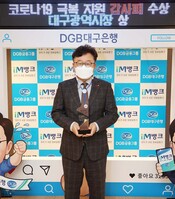 DGB대구은행(은행장 임성훈)은 19일 대구시(시장 권영진)로부터 코로나19 위기 상황에 지역 대표은행으로 다양한 지원 활동을 한 것에 대한 감사패를 받았다. 코로나19 이후부터 DGB대구은행은 다양한 금융지원 정책, 임직원의 마음을 모은 사회공헌활동 등으로 지역 내수