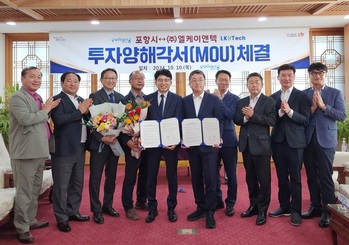 포항시(시장 이강덕)는 10일 시청 대외협력실에서 이차전지 소재 부품 제조 기업 ㈜엘케이앤텍와 투자양해각서(MOU)를 체결했다.이번 협약으로 엘케이앤텍은 포항 영일만4일반산업단지 내 1600평 부지에 오는 2027년까지 총 45억을 투자해 이차전지 소재 부품 사업을 위