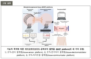 POSTECH(포항공과대학교) 기계공학과·IT융합공학과·융합대학원·생명과학과 장진아 교수, 미래IT융합연구원 용의중 박사, 기계공학과 통합과정 김지환 씨 연구팀이 ‘전자기술’과 ‘인공조직’을 결합한 ‘바이오하이브리드-공학조직(Biohybrid-Engineered Tis