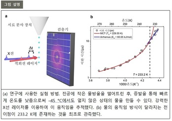 POSTECH 화학과 김경환 교수, 통합과정 신명식 씨 연구팀은 스웨덴 스톡홀름대 물리학과 앤더스 닐슨 교수 연구팀과의 공동연구를 통해 영하 45도에서 얼지 않은 물에서 온도에 따른 끈적임의 경향성이 달라진다는 사실을 최초로 관측했다. 이번 성과는 물리학 분야