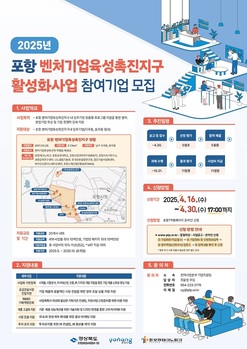 (재)포항테크노파크(원장 배영호, 이하 포항TP)는 지역 유망 벤처기업의 기술사업화 촉진과 창업 생태계 활성화를 위한 ‘2025년 포항 벤처기업육성촉진지구 활성화 사업’ 참여기업을 오는 30일까지 모집한다고 밝혔다.‘벤처기업육성촉진지구’는 ‘벤처기업육성에 관한 특별조치