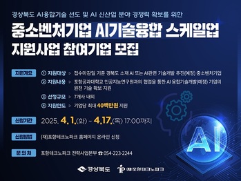 (재)포항테크노파크(원장 배영호, 이하 포항TP)는 AI 및 AI융합기술의 경쟁력 강화를 지원하고, 관련 기업의 기술 고도화 및 신산업 분야 진출을 돕기 위해 ‘중소벤처기업 AI 기술융합 스케일업 지원사업(이하 본 사업)’의 지원기업을 오는 17일까지 모집한다고 밝혔다