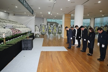 포항시의회(의장 김일만)는 지난달 31일 오전 경북도청 동락관에 마련된 ‘제주항공 여객기 사고 희생자 합동분향소’를 찾아 참배했다. 포항시의회를 대표해 김 의장이 헌화하고 묵념으로 희생자의 명복을 빌었다. 이어 함께 참석한 시의원들과 시의회 간부 공무원들도 엄