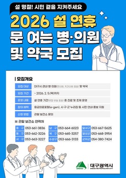 대구광역시는 설 명절 당일(2월 17일) 진료 가능한 의료기관 부족으로 발생할 수 있는 응급실 과밀화와 진료 공백에 대비하기 위해, 대구광역시의사회와 함께 ‘명절비상진료지원 사업’에 참여할 동네의원을 모집한다.설 명절 연휴에는 대다수의 동네의원이 휴진하면서 독감·감기
