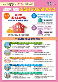 경북 김천시는 시민 생활밀착형 2026년도 본예산 1조4320억 원을 편성해 21일 김천시의회에 제출했다.이는 올해 대비 220억 원(1.56%) 증가한 수치로, 일반회계는 1조2870억 원, 특별회계는 1450억 원이다.김천시는 시민이 체감할 수 있는 시민 중심의 5