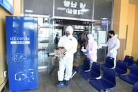 최기문 영천시장은 18일 영천버스터미널에서 코로나19 대응 차단방역 중인 민간단체 방역현장을 찾아 봉사자들을 격려하고 직접 방역에 참여했다. 출동 무조건 재난안전지킴이(회장 설동석)는 지난 3일부터 매일 5~6명씩 교대로 참여해 영천역과 버스터미널 등 다중이용