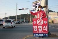 미래통합당 구미시을 김영식 예비후보가 12일 아침 인동사거리 출근인사에 이어 오후에는 구미 옥계사거리에서 근로자들를 상대로 퇴근길 인사를 하고 있다.최근 구미공단은 사상 초유의 코로나19 사태로 몸살을 앓고 있는 가운데 김 예비후보는 마스크를 낀 채 ’손씻기, 마스크’