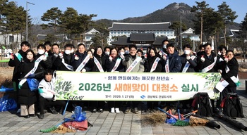 경상북도는 1월 27일 경북도청 주변 천년숲을 중심으로 새해맞이 대청소를 했다. 이번 대청소는 겨울철 낙엽 적치와 시설물 오염 등으로 저하된 공원 이용 환경을 개선하기 위한 조치로, 건설도시국 소속 7개 부서 과장·단장 및 직원 40명이 참여했다. 경