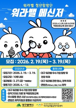 대구시행복진흥사회서비스원(이사장 배기철, 이하 대구행복진흥원) 산하 대구일생활균형지원센터는 지역의 워라밸(Work-Life Balance) 문화를 확산하고 우수 기업을 홍보할 청년탐방단 ‘워라밸 메신저’를 모집한다고 밝혔다.대구시행복진흥사회서비스원이 청년의 시각으로 지