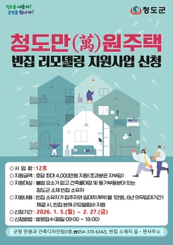 청도군이 빈집을 활용해 주거 취약계층의 정주 여건을 개선하고 지역 활력을 높이는 파격적인 주거 정책을 확대 추진한다.청도군(군수 김하수)은 빈집 활용을 통한 주거 안정과 정주 여건 개선을 위해 2026년도 ‘청도만(萬)원주택사업’ 빈집 사업자에 대한 추가모집을 실시한다