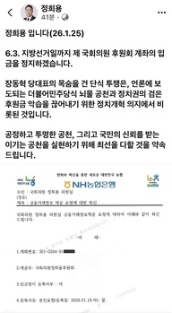 국민의힘 정희용 국회의원이 오는 6월 3일 실시되는 지방선거일까지 자신의 국회의원 후원회 계좌 운영을 전면 중단하기로 결정했다.정 의원은 25일 오전 SNS(페이스북)를 통해 "지방선거일까지 후원회 계좌 입금을 정지하겠다"고 공식 발표했다. 이번 결정은 선거 국면에서