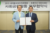 2015 세계물포럼 조직위원회(위원장 이정무·오른쪽))는 초록우산 어린이재단(회장 이제훈)과 최근 초록우산 어린이재단 대회의실에서 ‘지구촌 물 문제의 해결’이라는 공동의 목표를 위한 사회공헌활동 업무협약(MOU)을 체결했다.