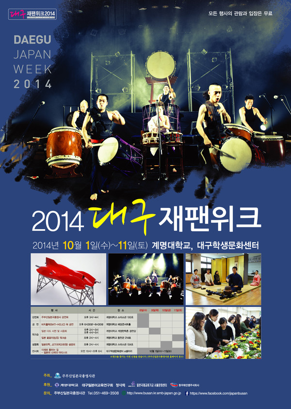 ‘2014 대구 재팬 위크(DAEGU JAPAN WEEK 2014)’가 10월 1~12일까지 계명대 성서캠퍼스, 대구학생문화센터 등지에서 열린다.