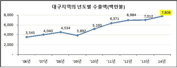 이 수치는 2009년(3,891백만 달러) 대비 100.6% 증가한 것으로 전국 평균 57.6%를 크게 상회하는 것으로 나타나 우리나라 6년 연속 무역흑자, 4년 연속 무역규모 1조 달러를 달성에도 대구가 크게 기여한 것으로 나타났다.