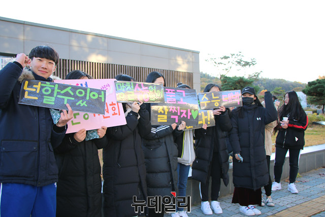 이날 경북고에는 수성구 바르게살기협의회 등 많은 단체들이 응원에 나선 가운데 수성구 청소년수련원 학생들이 수험생 선배들을 응원하고 있다.