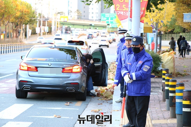 모범택시 운전자들이 추운 날씨에도 수험생 수송 차량을 안내하기 위해 대기하고 있다.