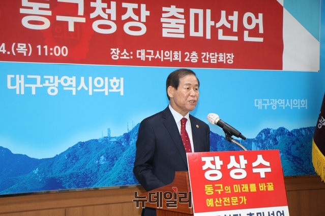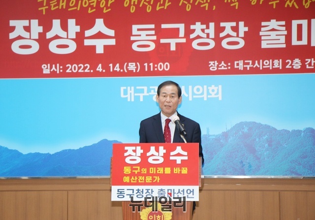 장상수 대구시의회 의장이 14일 오전 대구시의회 2층 간담회장에서 기자회견을 갖고 대구 동구청장 출마를 선언했다.◇장상수 의장 “동구는 대전환기, 도약 물꼬 트겠다”이날 장 의장은 “지난 20년 간 3선 동구의원, 재선 대구시의원으로 일해오면서 예산과 행정의 전문가로 동구의회와 대구시의회에서 의원, 의장으로 일하며 동구의 인프라 확충과 미래 먹거리를 위한 국·시비 예산을 지속적으로 확보해왔다”며 “동구는 지금 대전환기를 맞이하고 있다. 고도 제한과 항공소음, 개발제한구역, 하천구역 규제에 발목이 잡혀 활력을 잃어가는 도시로 머무르냐, 천지가 개벽할 로드맵으로 도약의 물꼬를 트느냐는 중요한 갈림길에 서 있다”고 강조했다.그러면서 “반세기 동안 동구의 개발을 막아왔던 K-2 이전으로 향후 100년을 좌우할 아주 중대한 시기다. 미래에 대한 방향 제시, 코로나19로 인한 추락한 민생 회복이 절실한 상황으로, 이러한 막대한 사안과 더 나은 동구를 위해 더 이상 지체할 수 없어 직접 구정에 뛰어들기로 했다”며 출마 배경을 설명했다.이어 “동구에 터전을 잡은 지 50여 년, 동구 구민으로서 구의원, 시의원을 순차적으로 지내며 배우며 경험했다. 지금까지 쌓아온 경력을 토대로 경륜있는 구청장이라는 결실을 맺기 위해 이 자리에 섰다. 7가지 동구 핵심과제를 중심으로 확실한 변화, 혁신적인 동구 미래를 차근차근 현실화시킬 것”이라고 주장했다.이날 장 의장은 동구 발전 공약으로 △K2 후적지를 동구의 새로운 개혁도시로 조성 △2차 공공기관 이전 추진 등으로 양질의 일자리 창출 △안심권역을 ICT 기반 스마트 규제 혁신지구로 지정 △ 동구에 제2 대구의료원 유치해 공공의료 강화 △ 도시계획 규제와 개발제약 요인 완화 등 7가지를 제시했다.