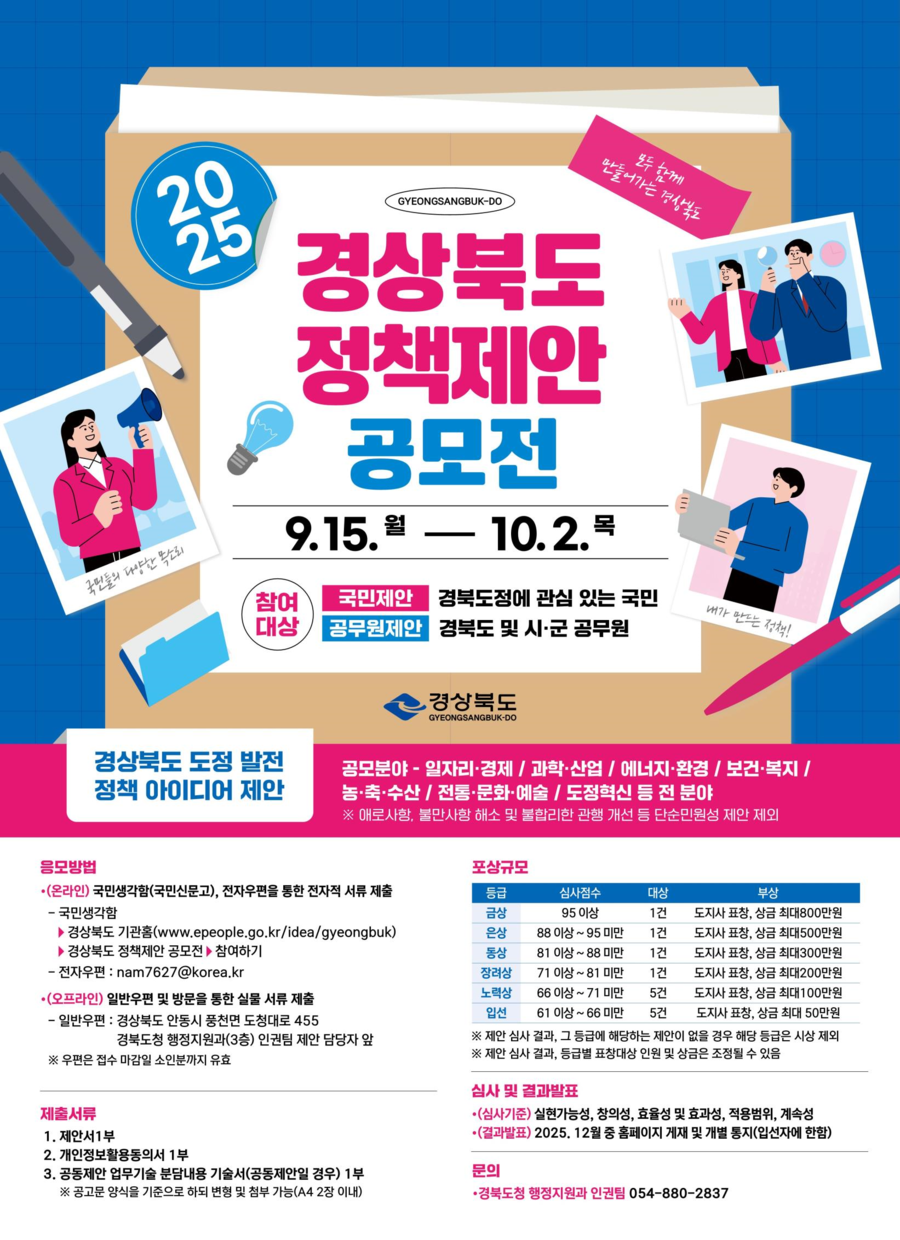 경북도는 도정발전과 제도 개선을 위한 정책 제안 공모전을 개최한다.도는 9월 15일부터 10월 2일까지 다양하고 창의적인 아이디어를 발굴해 도정 발전과 제도 개선에 반영하기 위해 ‘2025년 경상북도 정책 제안 공모전’을 개최한다고 밝혔다.이번 공모전에는 거주 지역 관계없이 경북도정에 관심 있는 국민이면 누구나 참여할 수 있다.분야는 일자리와 경제, 과학과 산업, 에너지와 환경, 보건과 복지, 농축산과 수산업, 전통문화와 예술, 도정 혁신 등 전 분야에 걸쳐 도정 발전을 위한 정책 아이디어를 자유롭게 응모할 수 있다.공모전에 참가하고자 하는 국민 또는 경북도 및 시군 공무원은 국민신문고(국민생각함–경상북도 기관홈)에 의견을 제출하거나, 전자 우편, 일반 우편 또는 방문 접수 중 한 가지 방법으로 제출하면 된다.제출된 제안은 실무 부서와 제안심사위원회 심사를 거쳐 12월 중 경상북도 누리집에 선정한 제안을 올리고, 우수한 제안은 도지사 표창과 최대 800만 원의 상금이 수여된다.박성수 경북도 안전행정실장은 “이번 공모전을 통해 도민이 체감할 수 있는 다양한 아이디어가 도정에 반영될 수 있도록 적극 노력하겠다”며 “경북도정 발전을 위해 많은 분의 관심과 참여를 바란다”고 말했다.