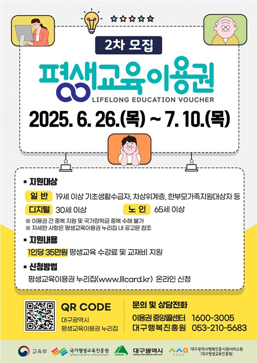 대구광역시행복진흥사회서비스원(이사장 배기철, 이하 대구행복진흥원)은 6월 26일부터 지원유형을 확대하여 2차 평생교육이용권 이용자를 모집하고 있다.